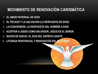 El documento describe el contenido de varios programas de catequesis y renovación carismática. El primer bloque del Proyecto Nacional de Catequesis de Adultos cubre el amor de Dios, el pecado como rechazo a Su amor, y el encuentro con Cristo Salvador. La Semana Misionera Popular propone una semana de actividades centradas en temas como el amor de Dios, la bienaventuranzas de Jesús, aceptar a Jesús como Salvador, el perdón, y el Espíritu Santo en la comunidad.