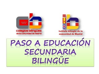 Este documento describe dos opciones para estudiar inglés en la escuela secundaria: un programa bilingüe y una sección bilingüe. El programa bilingüe ofrece una hora diaria de inglés y algunas asignaturas en inglés, mientras que la sección bilingüe tiene más contenido en inglés, incluyendo una hora diaria, ciencias sociales e historia, y ciencias en inglés. Los estudiantes son asignados a uno u otro basado en su puntaje en una prueba inicial de inglés.