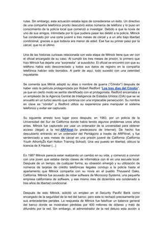 Kevin Mitnick, alias "El Cóndor", nació en 1963 en California y desde muy joven desarrolló una obsesión por los sistemas de comunicación electrónica. Fue arrestado varias veces en las décadas de 1980 y 1990 por delitos informáticos como hackear sistemas de telefonía y ordenadores. Su captura más famosa ocurrió en 1995 cuando el experto en seguridad Tsutomu Shimomura lo localizó y el FBI lo arrestó.