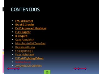 Este documento proporciona información sobre varios aviones de guerra importantes, incluidos sus nombres, precios y breves descripciones de sus capacidades y roles. Entre los aviones discutidos se encuentran el F/A-18 Hornet, EA-18G Growler, E-2D Advanced Hawkeye, F-22 Raptor, B-2 Spirit, Caza Azarakhsh, Mitsubishi A6M Zero-Sen y otros.