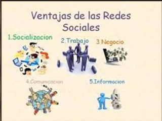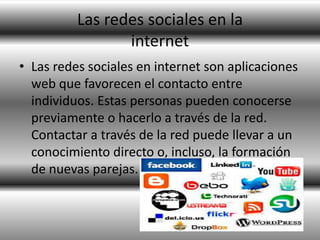 Las redes sociales en Internet son aplicaciones web que permiten a las personas conectarse e interactuar entre sí. Existen diferentes tipos de redes sociales como las genéricas como Facebook y Twitter, las profesionales como LinkedIn, y las verticales o temáticas centradas en intereses específicos. Si bien las redes sociales ofrecen ventajas como mantenerse en contacto con conocidos y hacer nuevos amigos, también plantean desventajas como la exposición de la privacidad del usuario y la posible adicción.