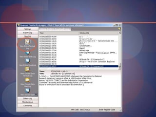 Este documento discute diferentes tipos de keyloggers y formas de evadirlos y eliminar spyware. Menciona keyloggers por hardware e interfaz, formas de evadirlos como usar un teclado virtual o firewall, y cómo usar Ccleaner y Malwarebytes para eliminar spyware descargándolos primero y luego ejecutándolos en modo seguro para limpiar archivos temporales, cookies, el registro y eliminar malware encontrado antes de reiniciar el ordenador en modo normal y escanear con un antivirus.