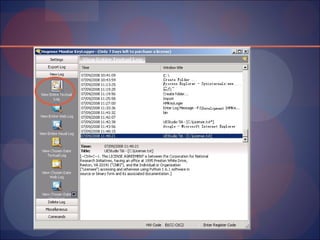El documento proporciona instrucciones para eliminar keyloggers y spyware de una computadora. Recomienda descargar y actualizar programas como CCleaner y Malwarebytes para limpiar archivos temporales, cookies y el registro del sistema. Luego instruye reiniciar la computadora en modo seguro y ejecutar un análisis completo con dichos programas para eliminar cualquier software malicioso detectado.