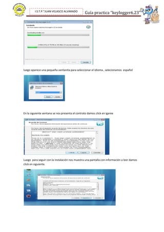 El documento proporciona instrucciones paso a paso para instalar el software de keylogger 6.23 en una computadora. Explica cómo ejecutar el instalador, seleccionar el idioma, aceptar los términos, elegir la carpeta de instalación, completar la configuración incluyendo las entradas a interceptar y la recepción de información por correo, y finalmente ejecutar el programa como administrador para ver las actividades registradas.