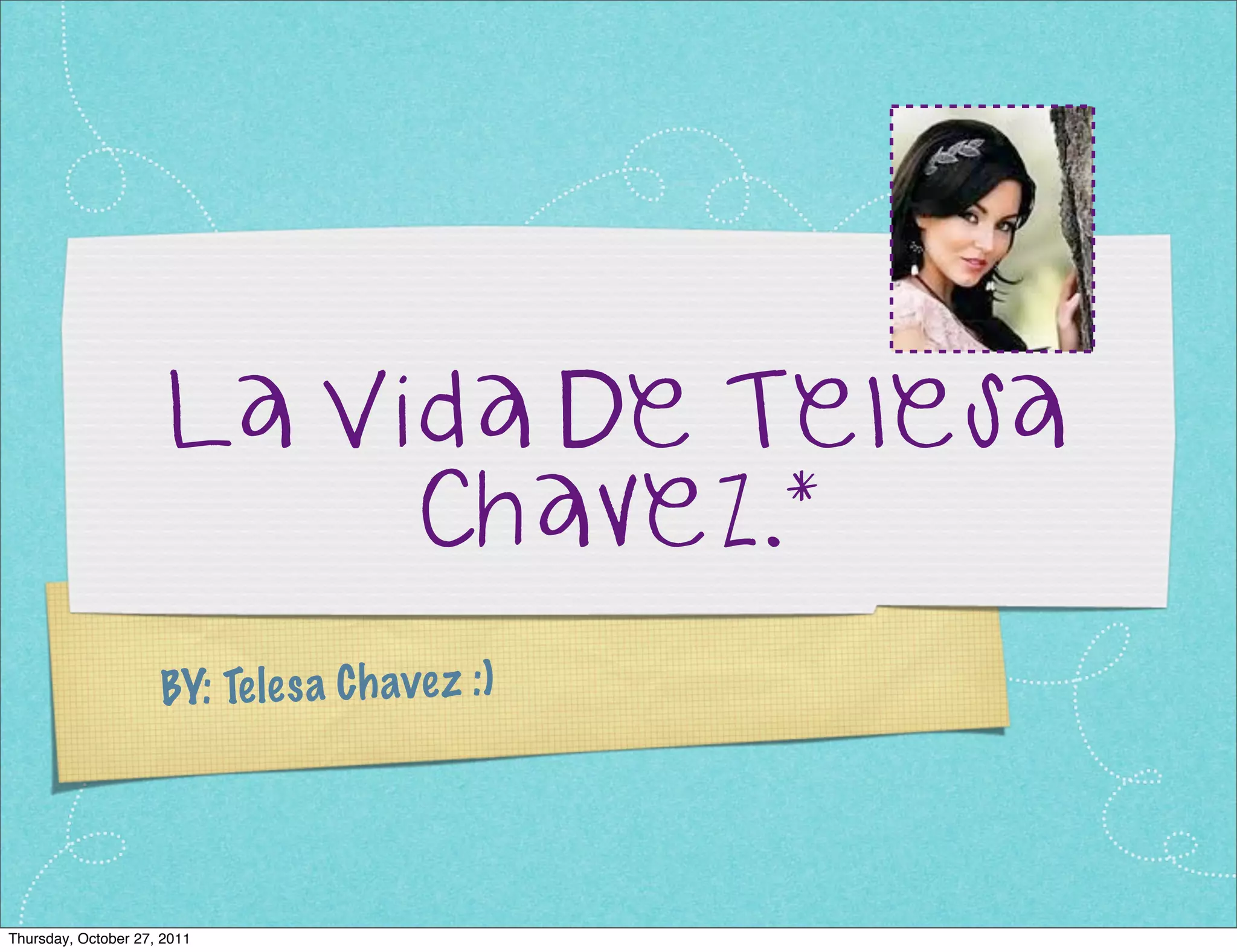 El documento habla brevemente sobre la vida de Telesa Chavez. Menciona que su mejor amiga se llama Aurora y que aunque es más bonita e inteligente que ella, Telesa sabe cómo hacer buenos negocios y conseguir dinero. También menciona que conoce a varias personas como Horiana, Arturo y Juana, y que conoce lugares como Europa y México.