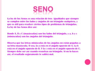 Este documento explica las leyes de los senos y cosenos, que son relaciones matemáticas útiles para resolver problemas de triángulos. La ley de los senos relaciona los lados y ángulos opuestos de un triángulo. La ley del coseno permite calcular un lado si se conocen los otros dos lados y el ángulo opuesto. El documento indica que para resolver un problema de triángulos, se debe usar la ley de los senos si se conocen dos ángulos y un lado, y la ley del coseno si se conocen