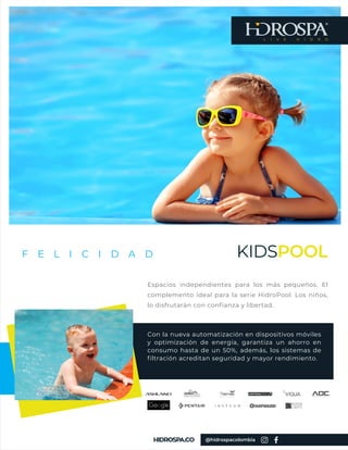 El documento presenta información sobre piscinas fabricadas con materiales compuestos de fibra de vidrio (PRFV). Describe las ventajas de este material, como su mayor resistencia y durabilidad en comparación con el concreto, así como menores costos de mantenimiento. También menciona los diseños y accesorios disponibles para piscinas infantiles (kidsPOOL).