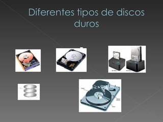 El disco duro es un dispositivo de almacenamiento no volátil que utiliza un sistema de grabación magnética digital. Contiene una serie de platos girando a alta velocidad sobre los cuales se sitúan cabezales para leer y escribir impulsos magnéticos. Existen diferentes estándares de interfaz como IDE, SCSI, SATA y FC. Las características clave incluyen el tiempo de acceso medio, velocidad de rotación y tasa de transferencia. Un disco duro típicamente contiene platos, cabezales de