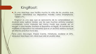 KingRoot es una aplicación que facilita la administración de dispositivos móviles al otorgar permisos de administrador o "root". Ofrece ventajas como mejorar el rendimiento, ahorrar batería y proteger datos, pero también presenta riesgos como quedar sin actualizaciones del sistema operativo, disminuir la seguridad e inestabilidad. Rootear un dispositivo requiere conocimientos avanzados para evitar posibles problemas.