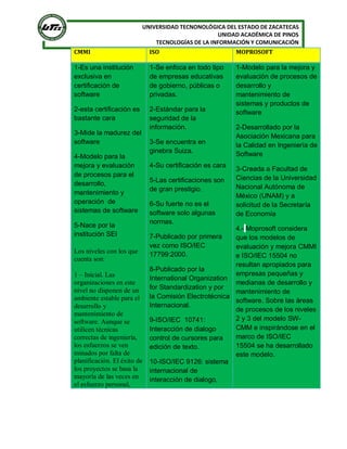 El documento presenta una tabla comparativa de tres modelos de calidad en el desarrollo de software: CMMI, ISO y Moprosoft. CMMI se enfoca en la certificación de software y mide la madurez de los procesos, ISO establece estándares para diferentes industrias y Moprosoft fue creado para empresas pequeñas y medianas inspirado en CMMI e ISO. Además, describe los cinco niveles de madurez de CMMI y lista ocho factores importantes para evaluar la calidad de software.