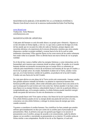 El documento habla sobre la energía fotónica y cómo puede usarse para curar enfermedades y lograr la paz interior. La respiración pránica con energía fotónica puede hacer desaparecer dolores de cabeza o calambres de forma "mágica". Las partículas fotónicas interactúan con la célula de signatura en la glándula pineal para sanar acumulaciones de células desorientadas.