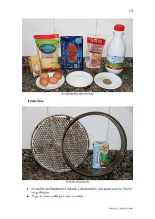Este documento proporciona una receta para preparar una Kirche Lorraine. Incluye instrucciones para hacer la masa, el relleno de tocino ahumado, salmón y queso, y hornear la Kirche en un molde desmontable a 250°C primero y luego a 170°C durante aproximadamente una hora.