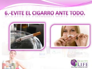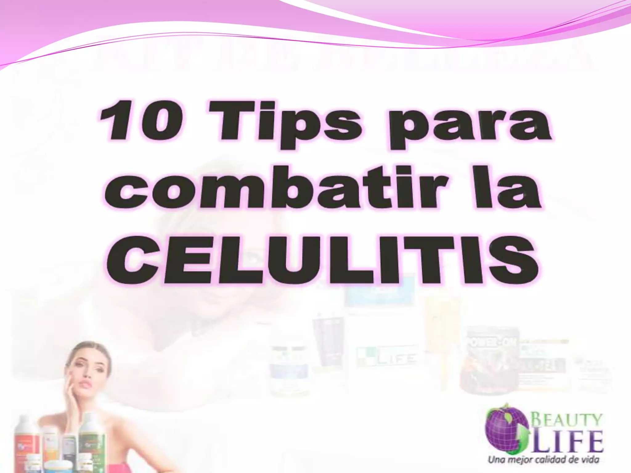 La celulitis afecta principalmente a las mujeres y se manifiesta como una "piel de naranja" causada por grasa atrapada bajo la piel. Los tratamientos existentes mejoran la celulitis temporalmente, pero lo más efectivo es llevar un estilo de vida saludable con dieta balanceada, ejercicio y agua. La celulitis se presenta comúnmente en muslos y caderas.