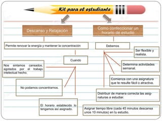Este documento ofrece consejos para mejorar la concentración y el rendimiento académico. Recomienda ser flexible y realista con los horarios, asignar períodos de descanso, y distribuir las asignaturas de una manera equilibrada. También sugiere actividades físicas y emocionales saludables, así como técnicas como escuchar activamente en clase, revisar antes de exámenes, y resolver con seguridad.