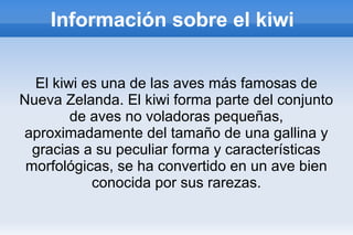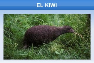 El kiwi es un ave no voladora nativa de Nueva Zelanda que mide aproximadamente el tamaño de una gallina. Es conocido por su plumaje marrón y rojo que le ayuda a camuflarse. Los machos kiwi se encargan de empollar los huevos en nidos subterráneos durante unas 10 semanas. El kiwi prefiere los bosques y matorrales densos y se alimenta de lombrices, hojas y frutos.