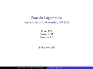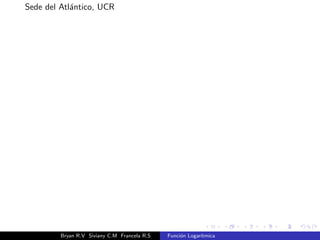 El documento presenta una introducción a la función logarítmica. Explica el contexto histórico de los logaritmos, su definición matemática, características como dominio, codominio y monotonía, propiedades como aditividad y aplicaciones a ecuaciones exponenciales. Finalmente, incluye ejercicios y contextos extra-matemáticos para ilustrar el uso de funciones logarítmicas.