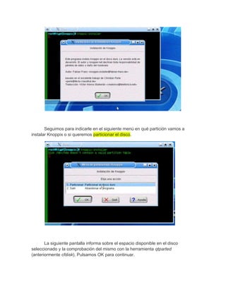 Este documento proporciona instrucciones para instalar la distribución Knoppix en el disco duro. Explica los pasos para particionar el disco, seleccionar el tipo de instalación, configurar los usuarios, copiar los archivos y actualizar el gestor de arranque, de modo que Knoppix quede instalado de forma permanente en el sistema.