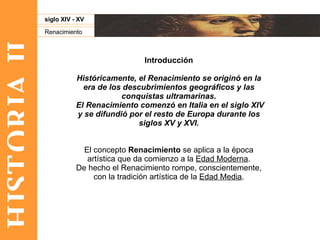 El documento proporciona una introducción general al Renacimiento en Europa entre los siglos XIV y XV. Explica cómo surgió en Italia y se difundió por el resto del continente, rompiendo con el arte medieval e impulsando un renovado interés por el pasado clásico. También describe los principales desarrollos artísticos e intelectuales de este período, incluido el surgimiento del humanismo y las principales escuelas pictóricas en Italia.