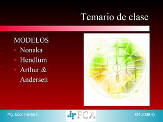 Este documento resume varios modelos de gestión del conocimiento. El modelo de Nonaka describe cuatro procesos de conversión del conocimiento (socialización, externalización, combinación e internalización) a través de diferentes niveles como individuos, grupos y organizaciones. El modelo también introduce el concepto de "Ba" como espacios donde se comparten conocimientos tácitos y explícitos. El modelo de Hendlum propone analizar conocimiento tácito-explícito a través de niveles sociales. El modelo de Arthur & Andersen propone sistemas como redes