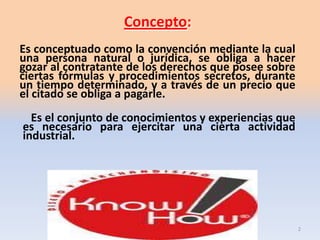 El documento define el concepto de Know How como un conjunto de conocimientos y experiencias técnicas que una persona u organización transfiere a otra a cambio de un pago. Esto incluye fórmulas, procesos y diseños no patentados que se transmiten generalmente a través de asistencia técnica. El contrato de Know How involucra a un licenciante que transfiere los conocimientos y a un licenciatario que los recibe y paga por ellos, y genera derechos y obligaciones para ambas partes como mantener la confidencialidad de la información