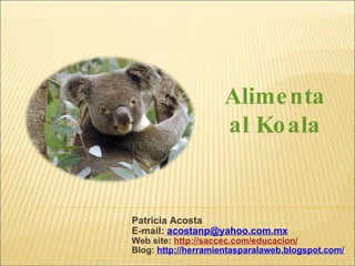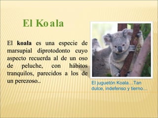 El koala es un marsupial nativo de Australia. Mide alrededor de 76 cm de largo y pesa entre 6-14 kg dependiendo de su sexo y ubicación geográfica. Se alimenta exclusivamente de las hojas de eucaliptos. Vive en los árboles y duerme 20 horas al día. Está amenazado por la tala de bosques, incendios, atropellos en carreteras y depredadores.