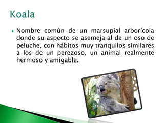 El documento describe al koala, un marsupial en peligro de extinción. Se detalla su apariencia física, hábitos nocturnos, dieta basada en hojas de eucaliptos, y declive en su población debido a la pérdida de hábitat y accidentes vehiculares. Además, se discuten los esfuerzos para proteger a los koalas y preservar sus hábitats naturales.