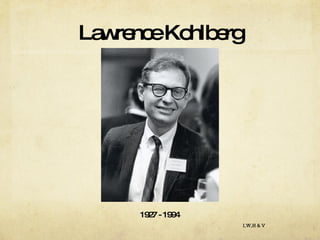 La teoría del desarrollo moral de Kohlberg propone que las personas pasan por 3 niveles principales de razonamiento moral a lo largo de su vida, cada uno con 2 etapas. El primer nivel se centra en el castigo y la obediencia, el segundo en las expectativas sociales, y el tercero en principios éticos universales. Kohlberg aplicó esta teoría al análisis de un dilema moral sobre un hombre que robó una medicina para salvar a su esposa moribunda.