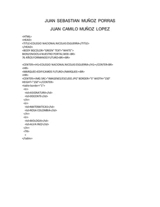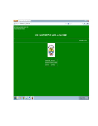 El documento presenta la página web del Colegio Nacional Nicolás Esguerra, una institución educativa con 76 años de historia que busca formar futuros líderes. La página incluye el escudo del colegio, una tabla con las asignaturas y docentes, y mensajes sobre la construcción de futuro.