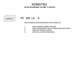 Este documento explica el sistema de nomenclatura de Komatsu para equipos de construcción como excavadoras, tractores, camiones volteos, motoniveladoras, cargadores y motores. Describe los códigos y letras usados para indicar el tipo de máquina, tamaño, transmisión, versiones y otras especificaciones.