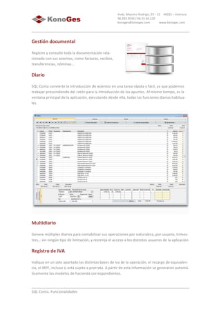 Este documento describe las funcionalidades del software de contabilidad SQL Conta, incluyendo la contabilidad multiempresa y multi ejercicio, la integración con la Agencia Tributaria para presentar modelos fiscales, y la exportación de información a paquetes como Excel y Word. También permite la gestión documental relacionada con asientos, la creación de múltiples diarios, y funciones como previsión de cobros y pagos, contabilidad analítica, amortizaciones y asientos programables.