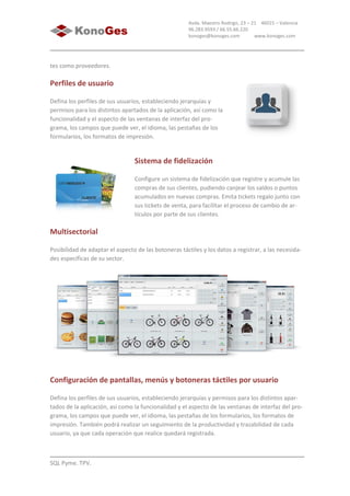 El documento describe un terminal punto de venta táctil para pequeñas y grandes empresas. Ofrece funciones como realizar ventas de manera intuitiva, mantener tickets en espera, generar vales, realizar arqueos de caja, y aceptar diferentes formas de pago. También permite configurar perfiles de usuario, implementar sistemas de fidelización de clientes, y adaptar el aspecto y datos según el sector comercial.