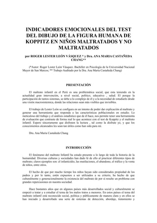 Este documento presenta un estudio sobre los indicadores emocionales del test del Dibujo de la Figura Humana de Koppitz en niños maltratados y no maltratados. El objetivo es analizar y comparar los indicadores emocionales que caracterizan a los niños maltratados vs no maltratados a través de este test. Se revisan antecedentes de estudios similares y se justifica la investigación debido a la alta incidencia de maltrato infantil en el Perú. El estudio utilizará una muestra de niños maltratados