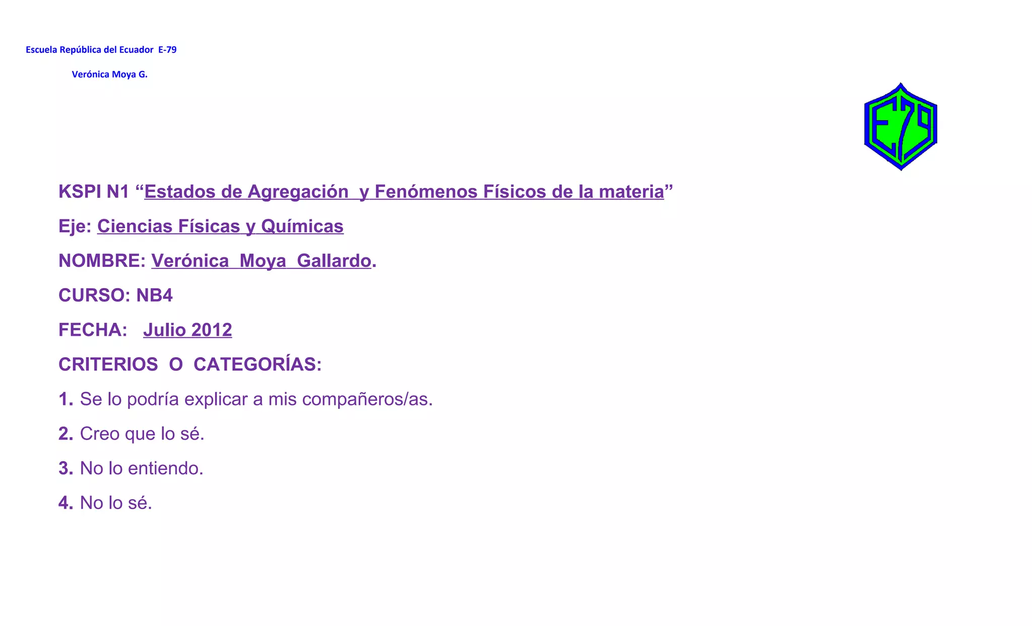 Este documento presenta un resumen de conocimientos sobre los estados de agregación y fenómenos físicos de la materia realizado por una estudiante llamada Verónica Moya Gallardo. Incluye una lista de afirmaciones sobre estos temas y una tabla para que la estudiante evalúe su nivel de comprensión sobre cada afirmación usando cuatro categorías: 1) Puedo explicarlo, 2) Creo que lo sé, 3) No lo entiendo, 4) No lo sé. El documento concluye con un espacio para observaciones.