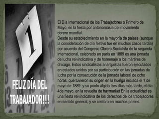 El Día Internacional de los Trabajadores, celebrado el 1 de mayo, conmemora la lucha de los trabajadores por los derechos laborales como la jornada de 8 horas. Se originó en 1889 cuando trabajadores anarquistas de Chicago fueron ejecutados por participar en huelgas para lograr la jornada de 8 horas. Actualmente es una fiesta para reivindicar los derechos de los trabajadores en todo el mundo.