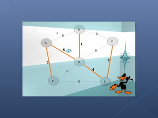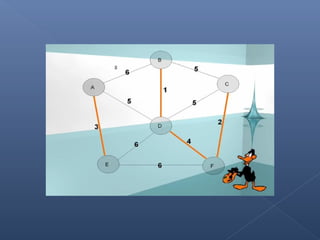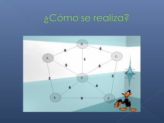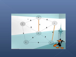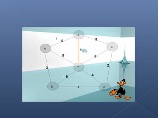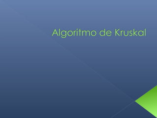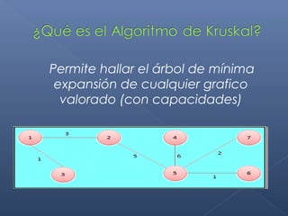 Este documento describe el algoritmo de Kruskal para encontrar el árbol de expansión mínima de un grafo valorado. El algoritmo ordena las aristas de mayor a menor peso y las va agregando al árbol si no forman ciclos, de modo que se obtiene un árbol que cubre todos los vértices con la suma mínima de pesos en las aristas.