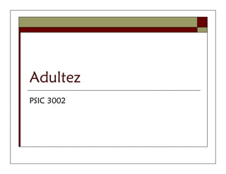 El documento resume los cambios físicos, sociales y cognitivos que ocurren en las diferentes etapas de la adultez, incluyendo la adultez temprana, intermedia y tardía. También describe las etapas del duelo ante la muerte según Elisabeth Kübler-Ross.