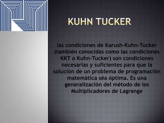 Este documento resume el método de los multiplicadores de Lagrange, que es una herramienta para resolver problemas de optimización con restricciones. Introduce variables adicionales llamadas multiplicadores de Lagrange para cada restricción, formando una combinación lineal que elimina las variables adicionales. Tiene aplicaciones en economía, como maximizar la utilidad de un consumidor sujeta a un presupuesto, y en teoría de control óptimo.