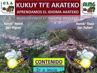 El documento es un glosario de vocabulario en idioma akateko y español, presentando palabras y frases organizadas por categorías, incluyendo nombres, objetos, acciones y números. Incluye términos específicos de la vida cotidiana y elementos culturales relevantes para la comunidad akateko. Además, el texto muestra la forma escrita y pronunciación de múltiples palabras en ambos idiomas.