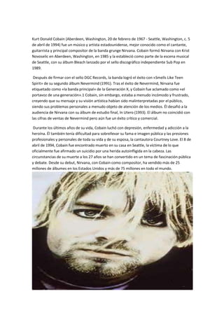 Kurt Cobain fue el cantante y guitarrista de la banda de grunge Nirvana. Formó Nirvana en 1985 y ayudó a establecer la escena musical de Seattle. Nirvana alcanzó el éxito masivo con su álbum Nevermind de 1991, pero Cobain se sentía incómodo con su fama y luchó contra la depresión y la adicción a la heroína. El 8 de abril de 1994, Cobain fue encontrado muerto por un disparo autoinfligido a la cabeza a los 27 años.