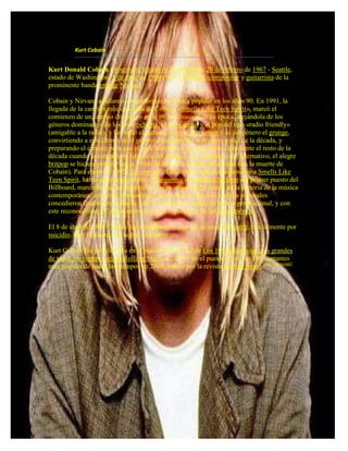 Kurt Cobain fue el cantante y guitarrista de la banda de grunge Nirvana. Ayudó a popularizar el rock alternativo en los años 90 con su canción más famosa "Smells Like Teen Spirit". Cobain se convirtió en un portavoz de su generación pero sufría de depresión y adicción a las drogas. Fue encontrado muerto por suicidio en 1994 a los 27 años.