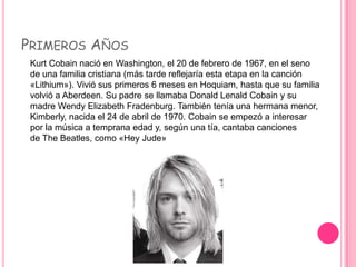 Kurt Cobain nació en 1967 en Washington. Tuvo problemas de adaptación tras el divorcio de sus padres y se interesó por la música desde pequeño. Formó el grupo Nirvana en los años 80 y alcanzó gran éxito en los 90, pero sufrió depresión y adicción a las drogas. Se casó con Courtney Love en 1992 y tuvieron una hija, pero su adicción empeoró. El 8 de abril de 1994 fue encontrado muerto por una sobredosis de heroína y disparo de escopeta en su casa de Seattle, en lo que fue