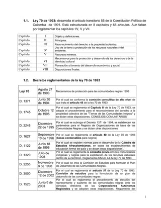 La Ley 70 de 1993 establece mecanismos de protección para las comunidades negras de Colombia. Reconoce el derecho a la propiedad colectiva de las tierras que han venido ocupando estas comunidades de acuerdo con sus prácticas tradicionales de producción. Crea los Consejos Comunitarios como forma de administración interna de las comunidades negras. Ha sido reglamentada por varios decretos que desarrollan aspectos como el procedimiento para el reconocimiento de la propiedad colectiva, la protección de los recursos natural