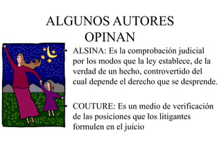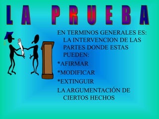 Este documento habla sobre la prueba en los procesos judiciales. Define la prueba como el medio para convencer al juez de la veracidad de los hechos presentados. Explica que quien presenta una pretensión debe probar los hechos, y quien la contradice debe probar los hechos que la extinguen. Además, describe las distintas etapas del procedimiento probatorio como el ofrecimiento, petitorio y diligenciamiento de pruebas.