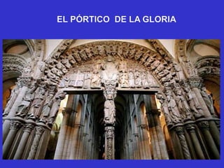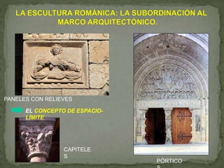 El documento describe la escultura románica en la portada de la Abadía de San Pedro de Moissac del siglo XII. Representa el Apocalipsis de San Juan en el tímpano, con Cristo en majestad rodeado de los cuatro evangelistas. Las figuras se adaptan al marco arquitectónico y convergen sus miradas en Cristo. El programa iconográfico instruía moralmente a los fieles sobre el destino de sus almas y la necesaria sumisión al orden establecido.