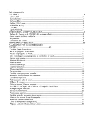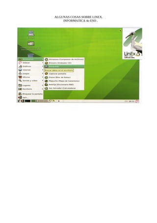GnuLinEx es una distribución de GNU/Linux basada en Debian que incluye el entorno GNOME, OpenOffice.org y otras aplicaciones. Explica la estructura de directorios y archivos en LinEx, cómo navegar por el escritorio de GNOME y usar Nautilus, y brevemente describe GNU/Linux y las suites ofimáticas.