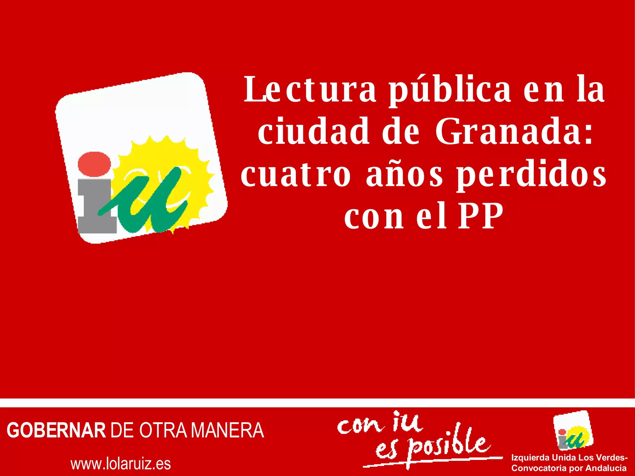 El documento habla sobre la necesidad de un plan de lectura pública en Granada. Propone ampliar la red de bibliotecas municipales mediante la apertura de nuevas bibliotecas y la ampliación de personal y horarios. También sugiere dinamizar las bibliotecas con actividades y programas, ampliar los fondos e informatizar el catálogo para incorporarlo a la red.