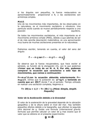 Este documento describe el movimiento de un péndulo simple y los objetivos de estudiar experimentalmente la relación entre el periodo de oscilación de un péndulo y factores como la longitud, la masa y la amplitud. También busca determinar el valor de la aceleración de la gravedad en Bucaramanga mediante experimentos con péndulos de diferentes masas y longitudes.
