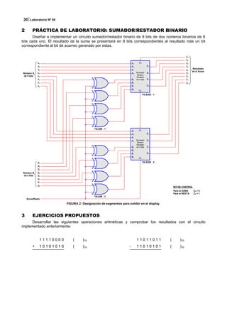 Este documento describe un circuito sumador/restador binario de 8 bits. Explica cómo utilizar sumadores binarios paralelos de 4 bits para sumar y restar números binarios de 8 bits. También incluye ejemplos de operaciones aritméticas binarias y una lista de materiales necesarios para implementar el circuito.