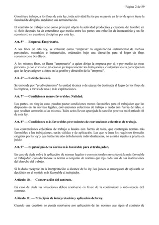 Este documento presenta los primeros 19 artículos de la Ley de Contrato de Trabajo de Argentina. Establece las fuentes de regulación del contrato de trabajo, su ámbito de aplicación, conceptos clave como trabajador, empleador, empresa, y principios generales como la irrenunciabilidad de derechos del trabajador y la interpretación a su favor.