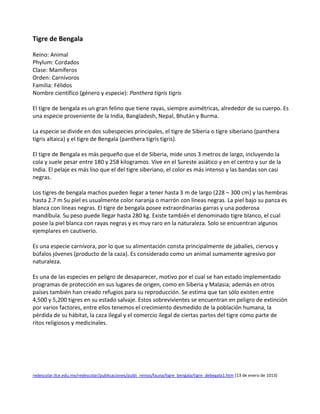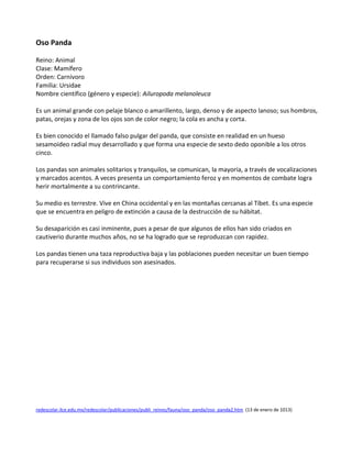 El documento proporciona información sobre el oso panda. Específicamente, describe que el oso panda es un mamífero carnívoro nativo de China occidental y las montañas cercanas al Tíbet. Es una especie en peligro de extinción debido a la destrucción de su hábitat. Los pandas tienen una baja tasa de reproducción y las poblaciones pueden tardar mucho en recuperarse si sus números disminuyen.